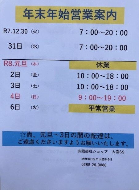 年末年始営業時間のご案内!